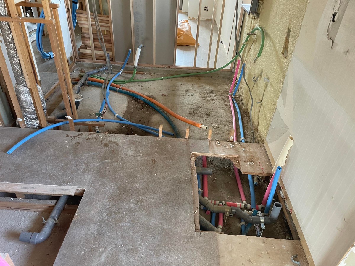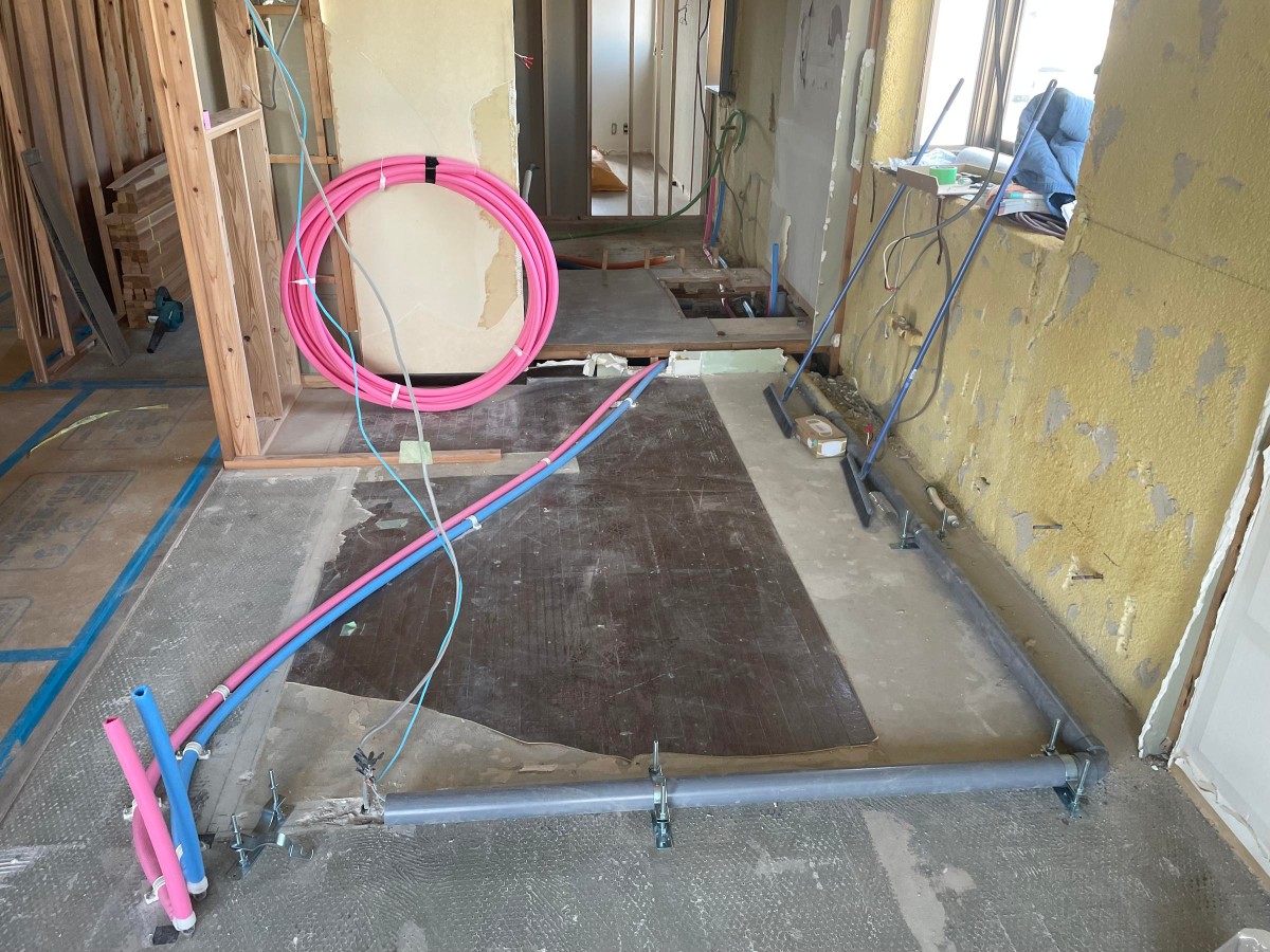 水回りの配管状況です。奥側に、ユニットバスが設置されます。