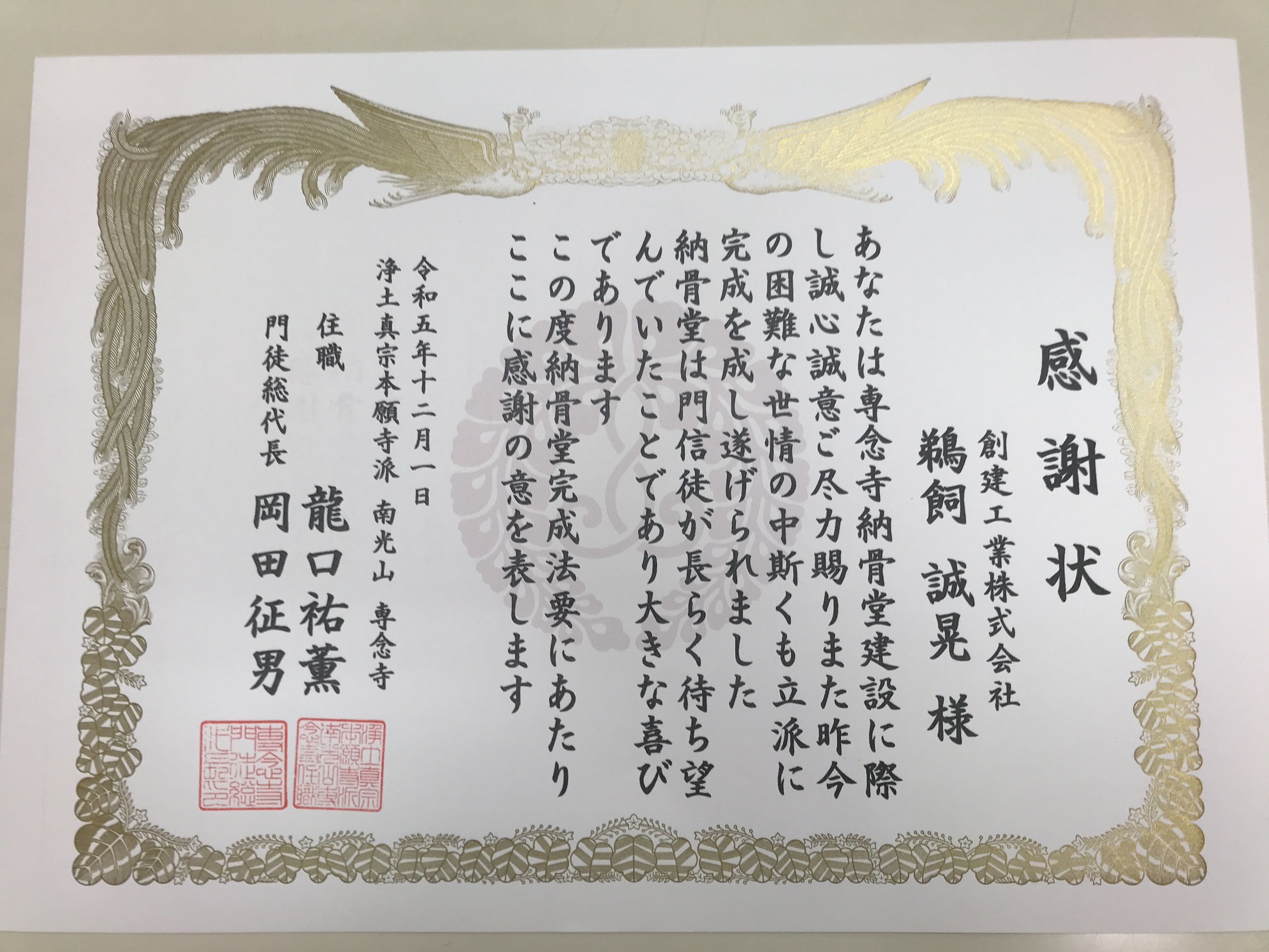 丁度1年前の12月2日に竣工した専念寺納骨堂ですが、本年12月1日に完成法要が執り行われ、感謝状を頂きました。